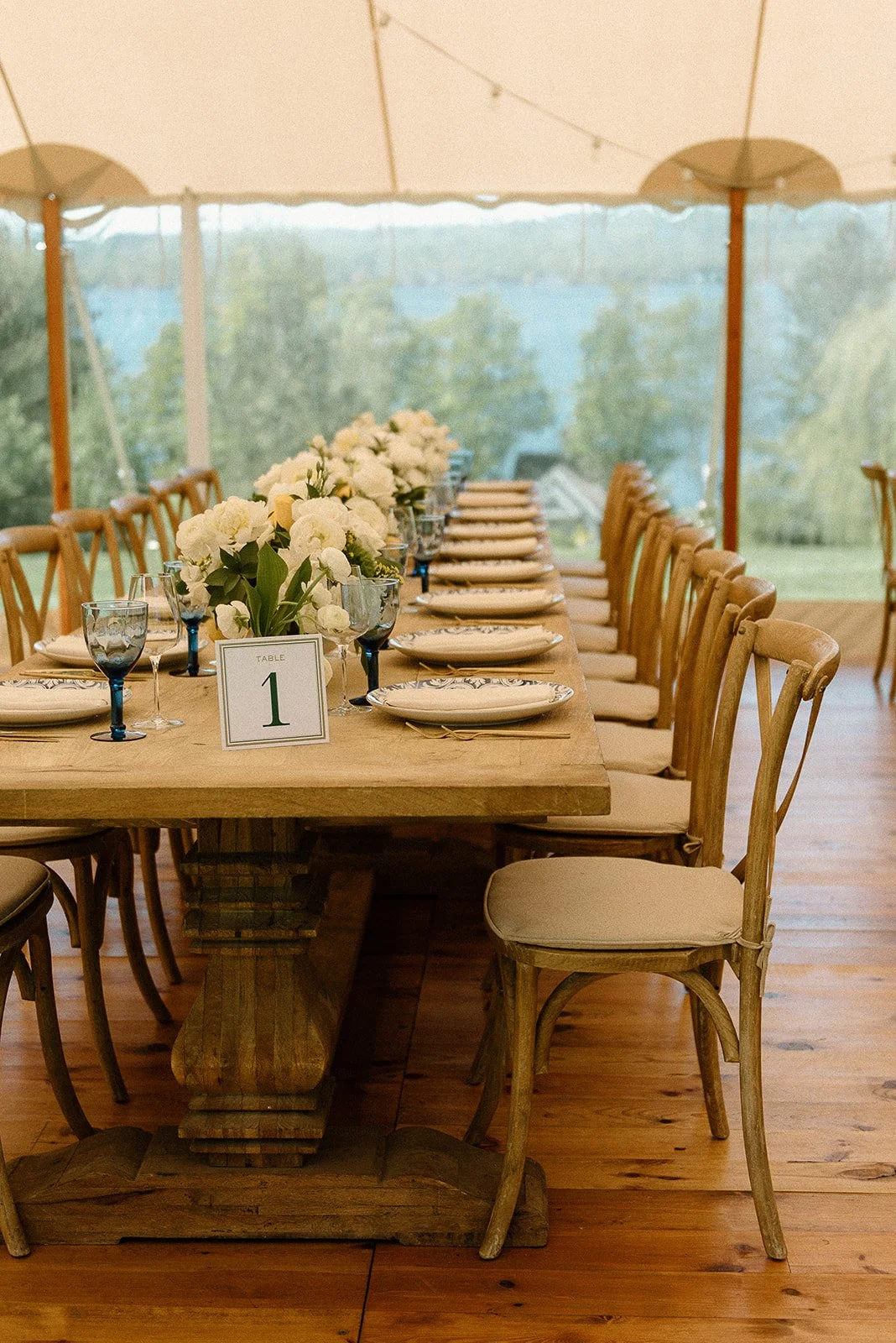 The cocktail was served around the pool and the pool house with hors d'oeuvres from Ristorante Gentile in Montréal with lunch following under a gorgeous Sperry tent. The table setting had a Mediterranean vibe with blue plates, white flowers and even some lemons in the flower arrangements on elegant country style wood tables. Erika Ludwick of Melica Events did an unbelievable job planning and designing this event.