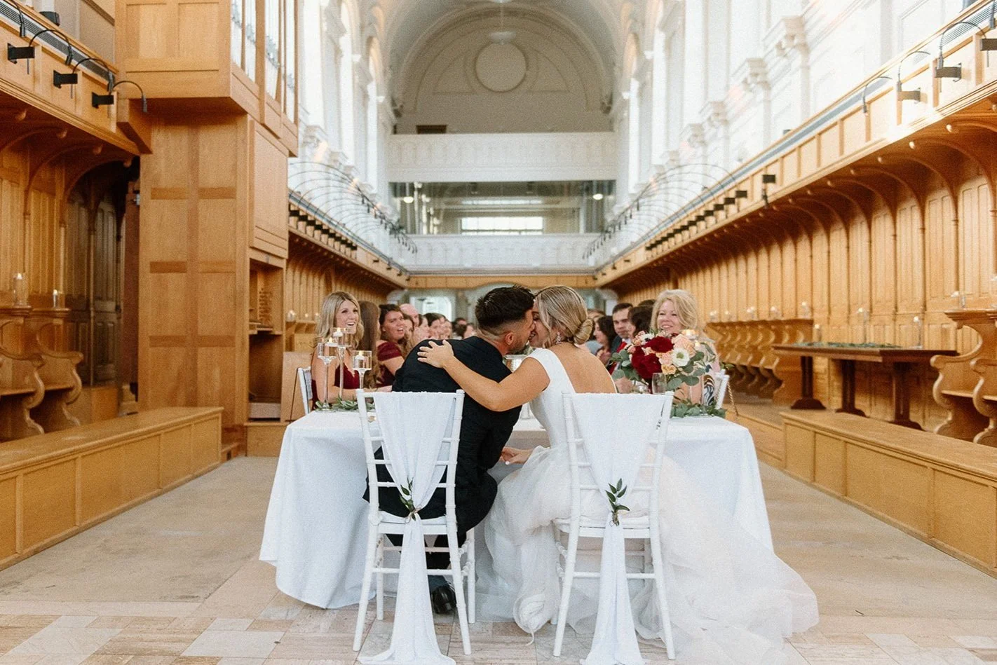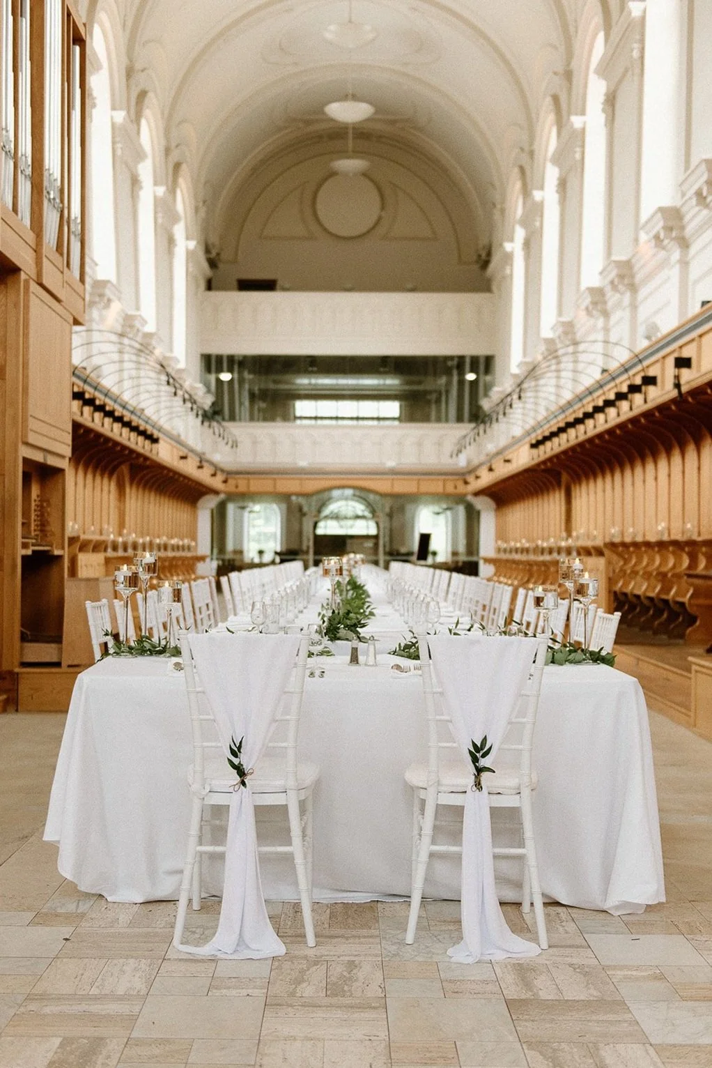 The reception was in the main chapel area of the Abbey, with a single long table set up for the meal against the backdrop of warm wood and cathedral white walls that ran up to a fabulous dome! It was so pretty! The first dance was beautiful, the lights dimmed in the chapel area to set a new mood and an even more impressive backdrop.