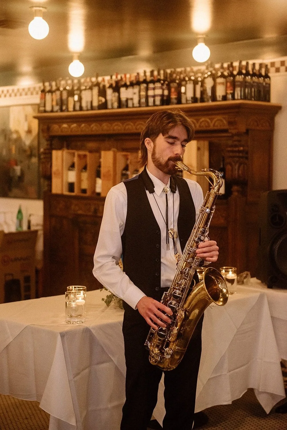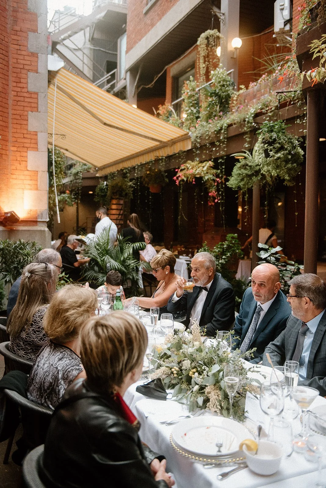 The venue was Café Il Cortile in downtown Montréal, and this is a slice of Italy hidden in a Canadian city! The reception was in their beautiful private courtyard, covered by flowers, plants and awnings. They had a saxophonist playing live while cocktails were served - Aperol Spritz were making the rounds! Italian food classics were served and everyone was in such a lovely mood. It was such a beautiful day, I could’ve stayed all night!